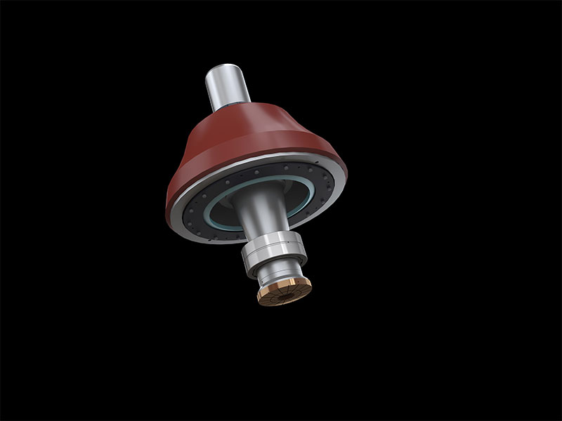 RC系列單缸液壓圓錐式破碎機(jī)工作過程中,電動機(jī)通過傳動裝置帶動偏心套旋轉(zhuǎn),動錐在偏心軸套的迫動下做旋轉(zhuǎn)擺動,動錐靠近定錐的區(qū)段即成為破碎腔,物料受到動錐和定錐的多次擠壓和撞擊而破碎。動錐離開該區(qū)段時(shí),該處已破碎至要求粒度的物料在自身重力作用下下落,從錐底排出。排料口的大小需要靠底部一個液壓缸的升降來調(diào)節(jié)。